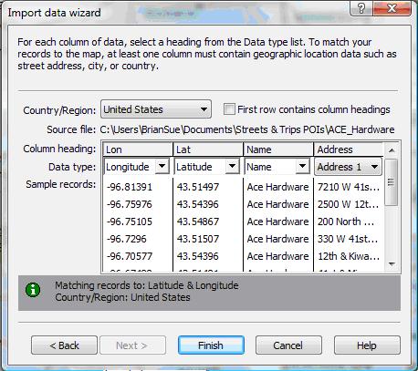 Our Import Data Wizard Pane changes again. This time we have some work to do. Note it has listed Longitude numbers in the first column and then Latitude and then the name of the business and then the address. We need to change the Column Heading and the Data Type line accordingly. Not everyone who creates POI files does it the same way so each file could be a different set-up.